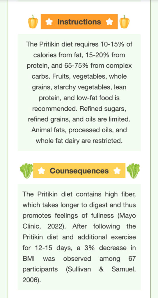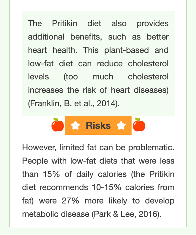 Davidson, K. (2020, November 24). Pritikin Diet Review: Benefits, downsides, and more. Healthline. https://www.healthline.com/nutrition/pritikin-diet-review#the-programFranklin, B. A., Durstine, J. L., Roberts, C. K., & Barnard, R. J. (2014). Impact of diet and exercise on lipid management in the modern era. Best practice & research. Clinical endocrinology & metabolism, 28(3), 405–421. https://doi.org/10.1016/j.beem.2014.01.005