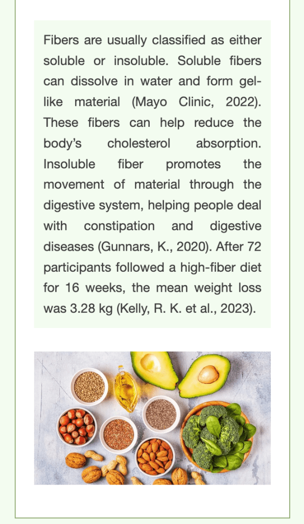 Mayo Foundation for Medical Education and Research. (2022, November 4). How to add more fiber to your diet. Mayo Clinic. https://www.mayoclinic.org/healthy-lifestyle/nutrition-and-healthy-eating/in-depth/fiber/art-20043983